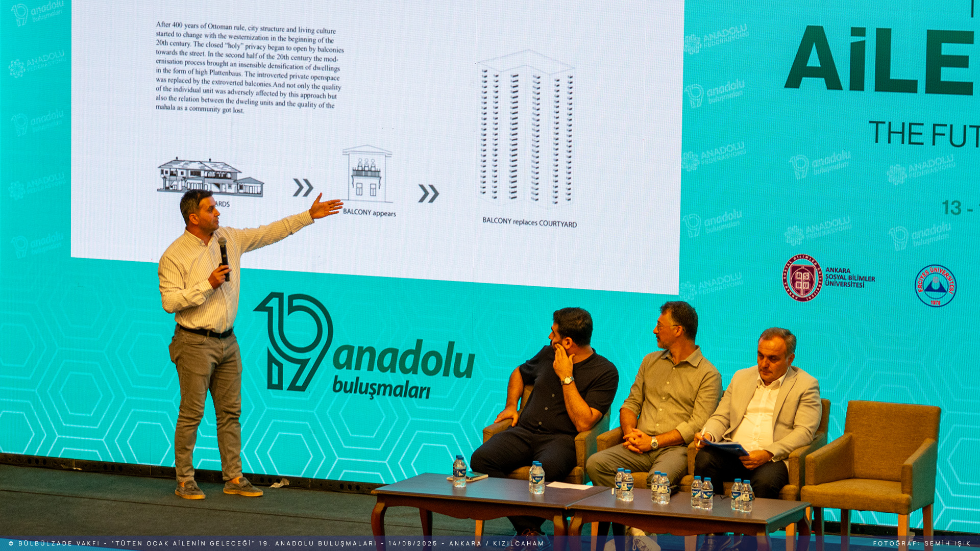 Anadolu Buluşmaları'nın 2. Gün 1. Oturumu “Aile: Bir Kavramın Soykütüğü” başlığı altında gerçekleşti. Prof. Dr. Şeyhmus Demir’in moderatörlüğünü yaptığı oturuma Şeref Malkoç, Prof. Dr. Muhammet Ruhat Yaşar ve Prof. Dr. Mahsum Aytepe konuk oldu. Nostaljik anlamda aile konusunun nasıl yaşandığı değil gelecek için perspektif oluşturacağı konusu konuşuldu.