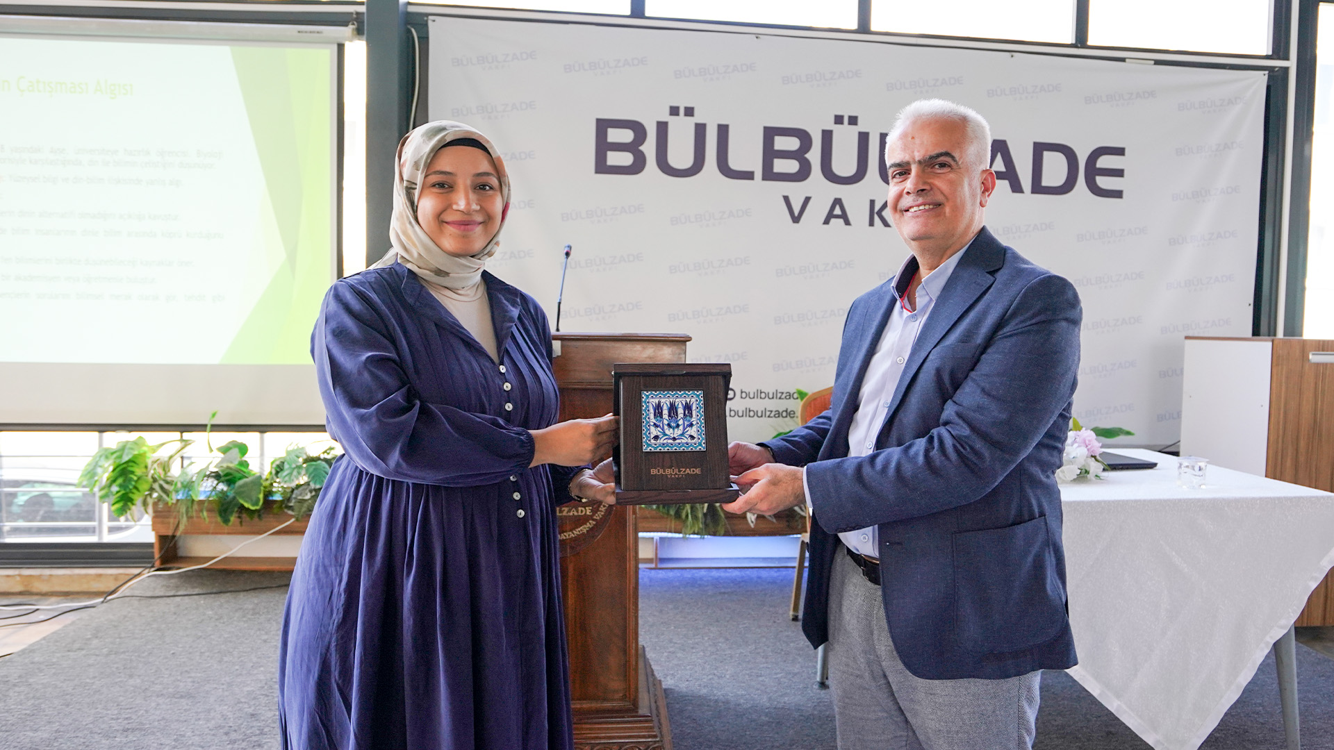 Söyleşinin ardından, katkılarından dolayı Prof. Dr. Mustafa Ünverdi’ye Bülbülzade Vakfı Öğretmen Komisyonu üyesi Betül Kaplan tarafından plaket takdim edildi.
