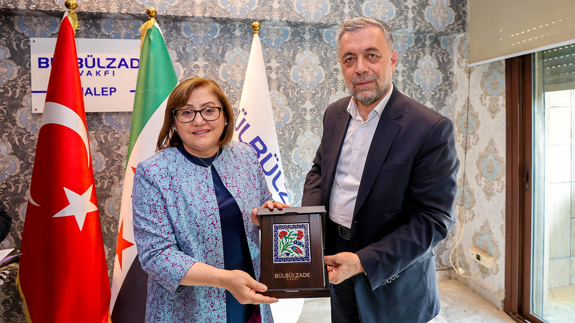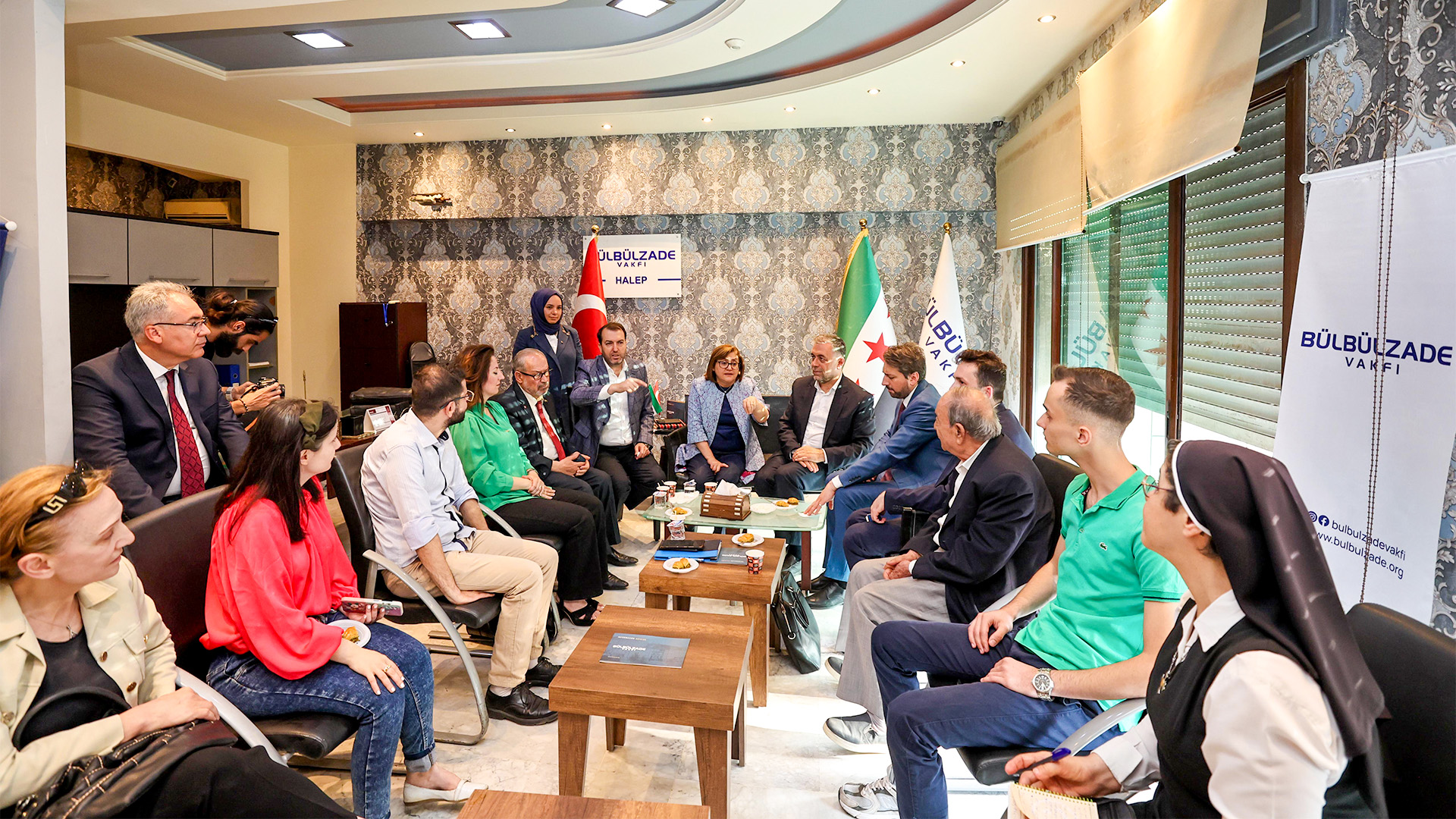 Gaziantep Büyükşehir Belediye Başkanı Fatma Şahin ve Halep Başkonsolosu Hakan Cengiz beraberlerindeki heyetler, 29 Mayıs 2025 tarihinde, Bülbülzade Vakfı Halep İrtibat Ofisi’ni ziyaret ederek vakıf gönüllüleri ve bölgedeki kanaat önderleriyle bir araya geldi.