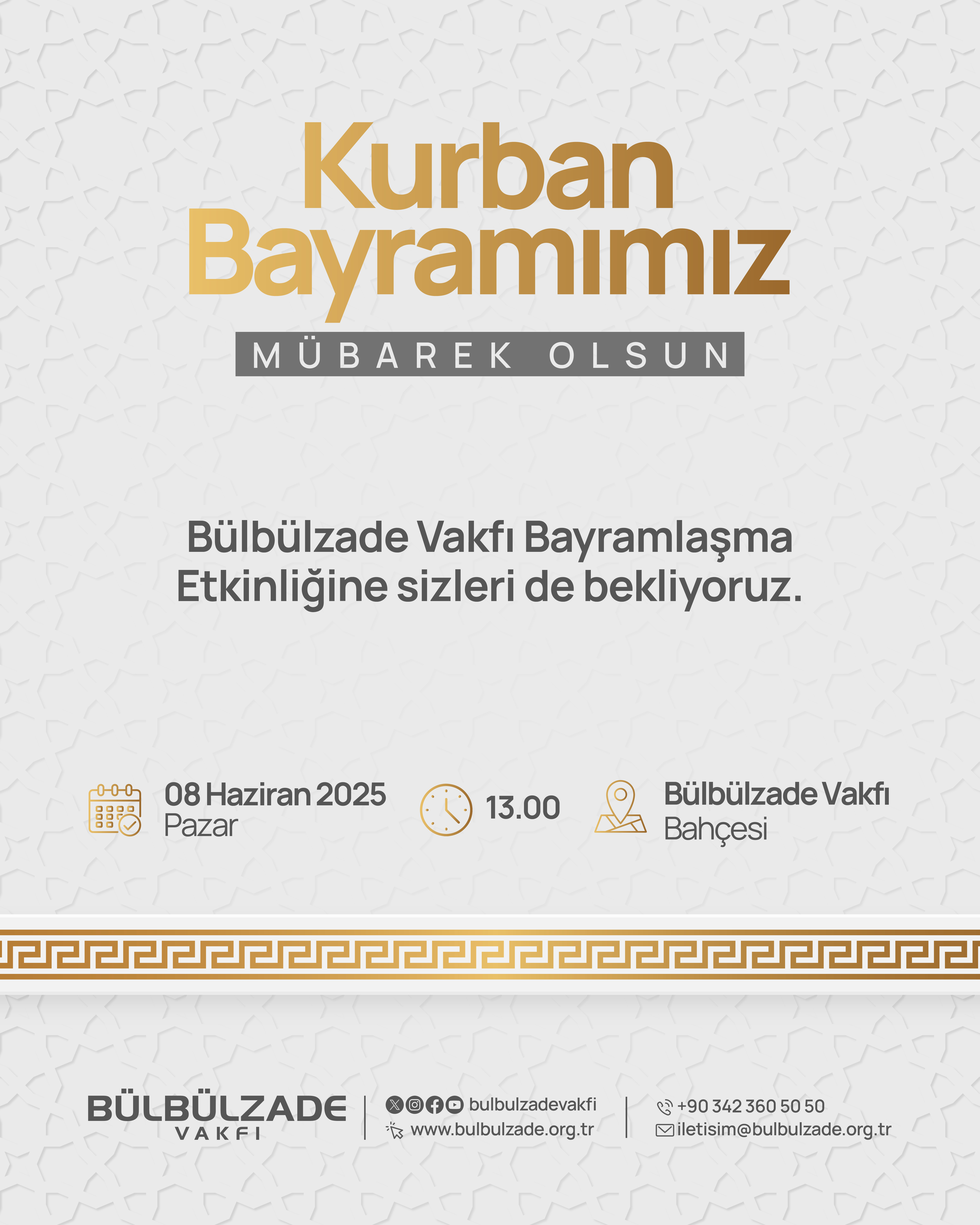 Bülbülzade Vakfı Bayramlaşma Etkinliğine sizleri de bekliyoruz. Bayramın Üçüncü günü 8 Haziran 2025 Pazar tarihinde saat 13:00'da, Bülbülzade Vakfı Kış Bahçesi'nde bayramlaşma etkinliğimize davetlisiniz.