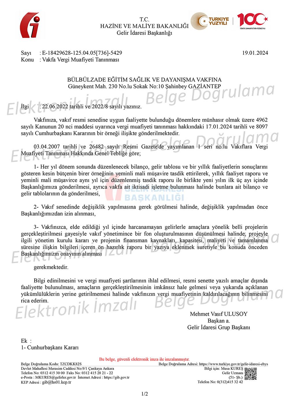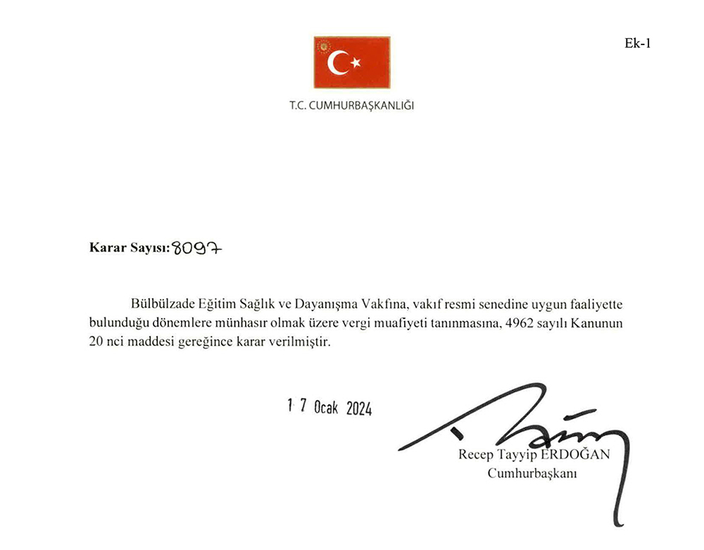 Vakfımızın başvurusu sonucunda, 17 Ocak 2024 tarihli ve 8097 sayılı Cumhurbaşkanı kararı ile, 4962 sayılı Kanunun 20. Maddesi gereğince vakfımıza “vergi muafiyeti” tanınmıştır. Adı geçen 4962 sayılı Kanun, Vakıflara Vergi Muafiyeti Tanınması Hakkında Genel Tebliğ ve ilgili diğer yasalarla vakfımıza tanınan hakların bir kısmına aşağıda yer verilmiştir.