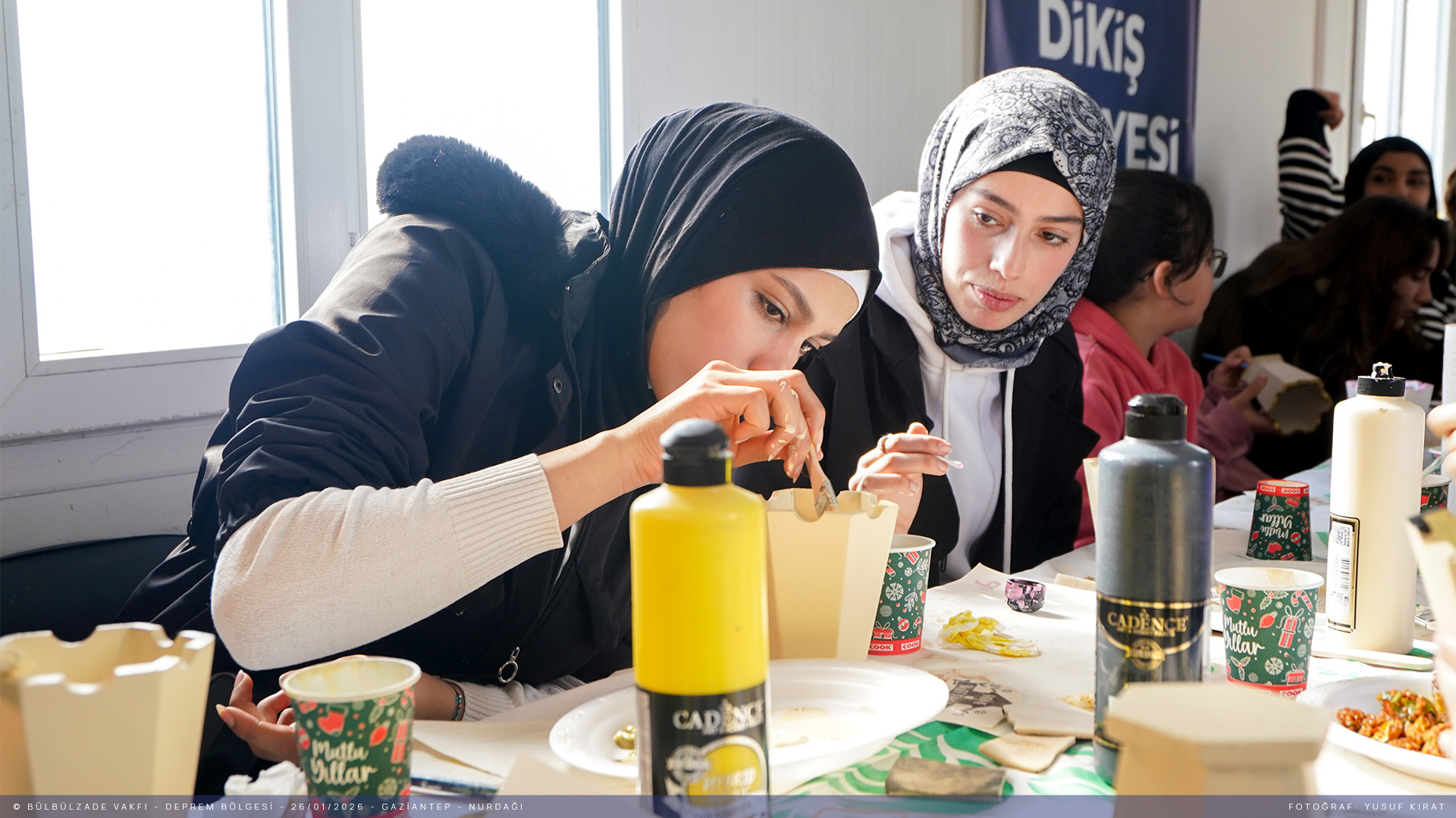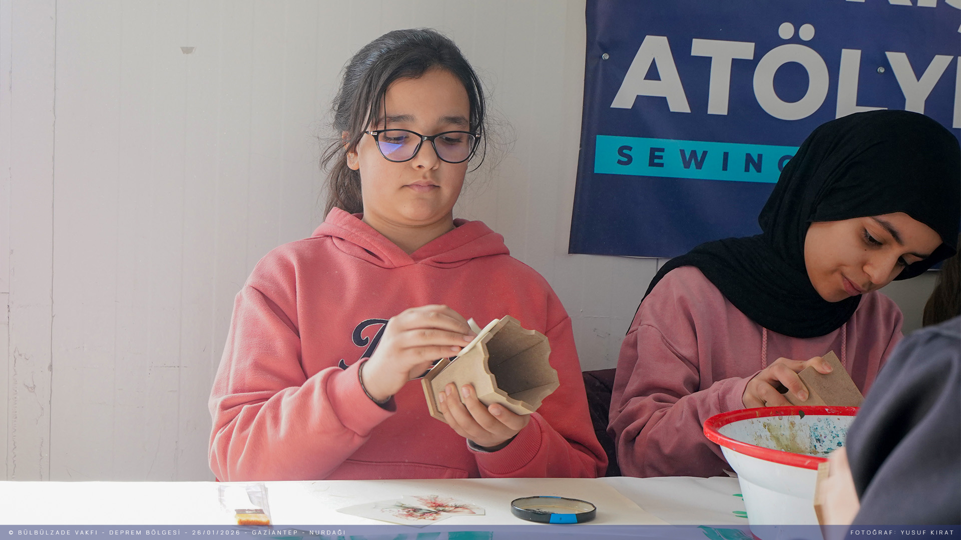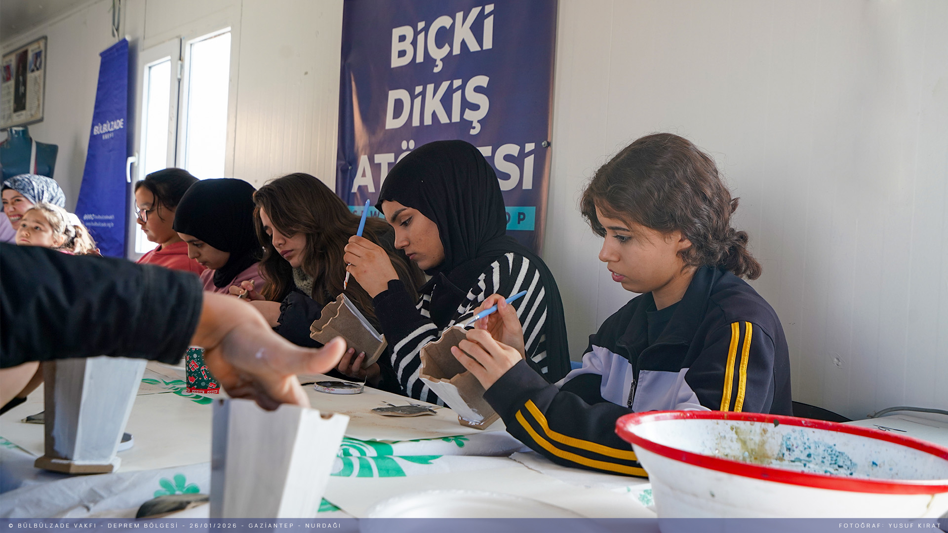 Depremin ilk gününden beri İslahiye ve Nurdağı’nda depremden etkilenen kardeşlerimizi bir an olsun yalnız bırakmadık. Üç yıldır sahadayız ve hayatın devam etmesi için var gücümüzle çalışıyoruz. Bugüne dek çok sayıda proje ve etkinliğe ev sahipliği yaptığımız ilçelerde Biçki Dikiş Kurslarımız hizmet vermeye devam ediyor. Depremzedelerin sosyal ve psikolojik rehabilitasyonuna destek olmak amacıyla anlamlı projelere imza atmaya devam ediyoruz. Bugün de "Renklerle Umuda Dokunuyoruz" sloganıyla Nurdağı’nda depremin izlerini silmek üzere ahşap boyama atölyesi düzenledik. Sanatın iyileştirici gücüyle bir araya geldik.